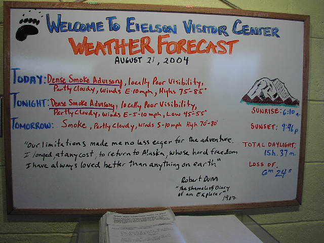 中に入るとすぐに、その日の天気予報が目に入ります。アイルソンはマッキンリー山を園内でマッキンリー山を最も美しく手軽に楽しめる場所です。天気次第ではマッキンリー山は全く見えません。(毎年8月は7割くらいの日は見れません。)マッキンリー山は見るだけでも難しい山なのです。ここから50キロくらいの距離なのですが...この日も濃い煙という予報ですが。 |