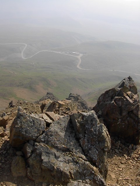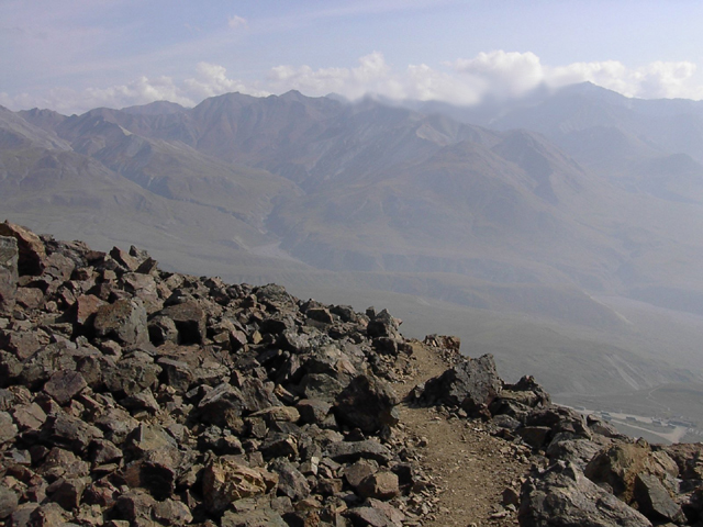 と、山頂からは遠く足元に出発しだしたアイルソンのビジターセンターが見えて、正面には下からは見えなかった山々が目に入ります。左右は登ってきた途中と同じく断崖絶壁です。いやぁ、いい景色だ。 |
