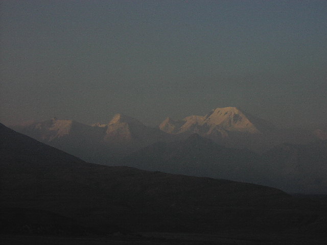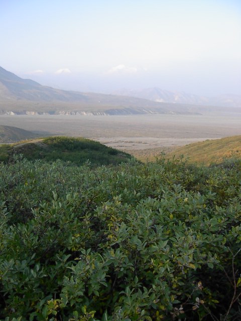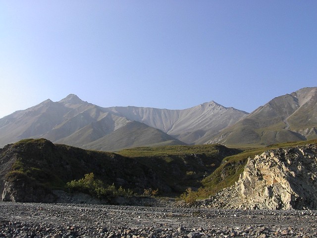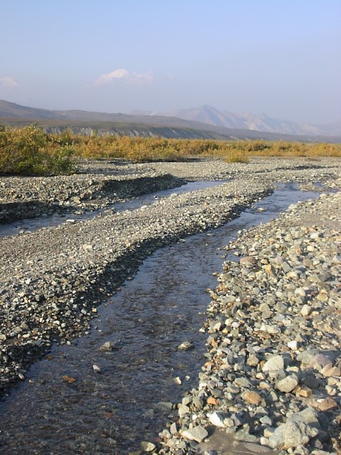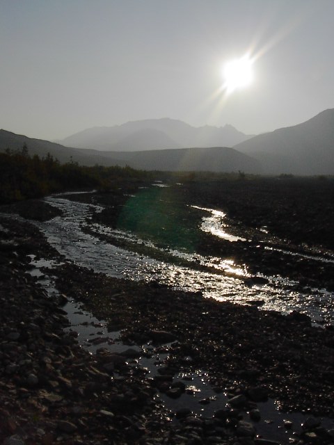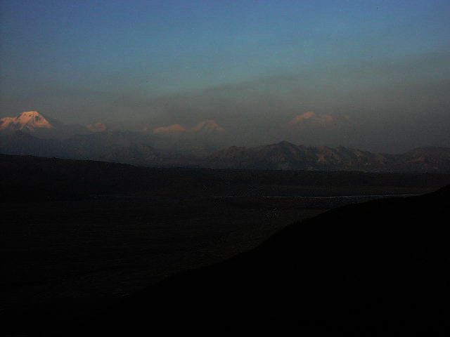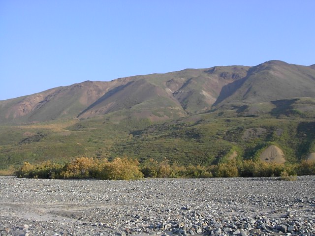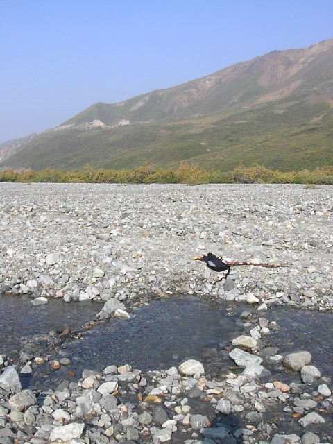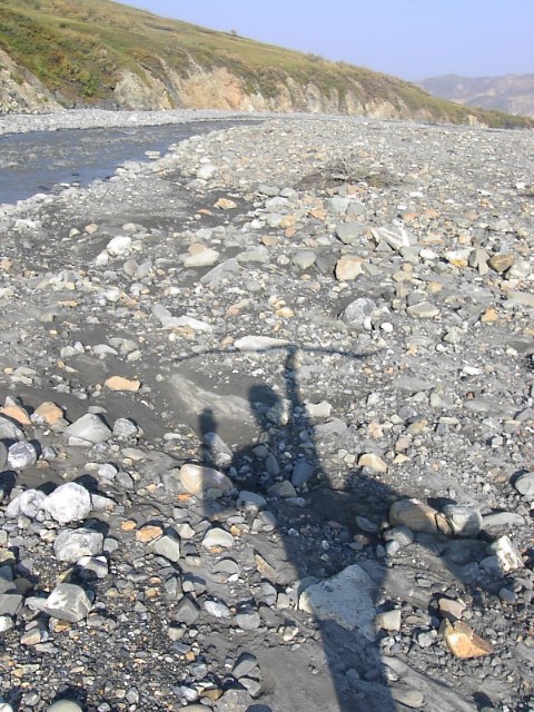 だだっ広い河原でした。スケールがデッカイんです。果てしなく河原とツンドラが広がり、その果てに、山々がある、そしてその上に更に空に浮かぶマッキンリーがあるんです。本当に雄大な光景でした。 |