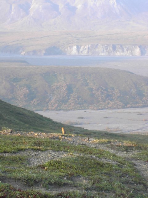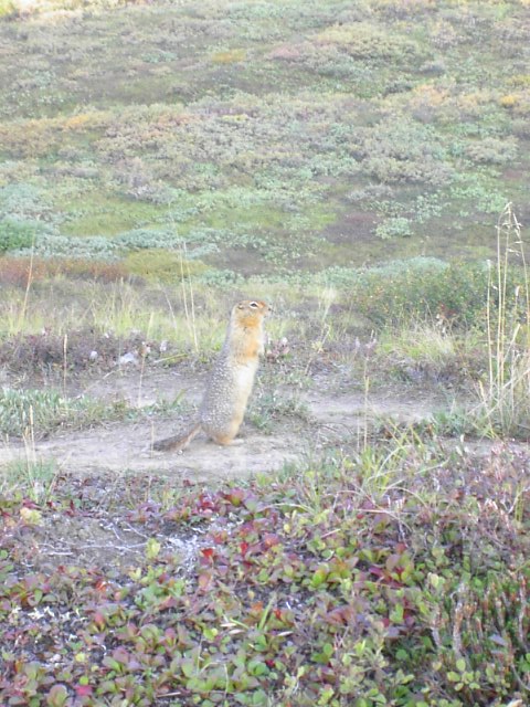 北極地リスでした。デナリでは何処でも見かける奴ですが、このEilson周辺には特に沢山います。2本足で立って、思いっきり背伸びしている小さなリスがいたら、それは間違いなく北極地リスです。この身を伸ばして立ち上がる彼らの姿はデナリ固有の思い出の光景です。 |