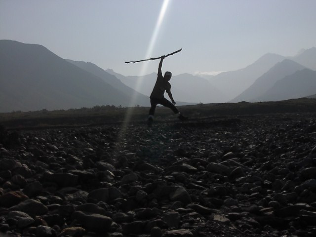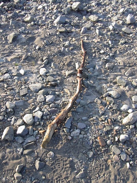 潅木を抜けて河原に出ると、杖になりそうな程良い長さの木が落ちていたのでそれを拾って旅の供にもって行きました。 |