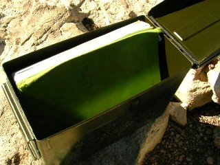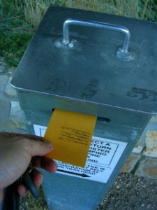 鉄の箱があって中にはノートとペンが入っていました。記念にひと言、凡人カキコ