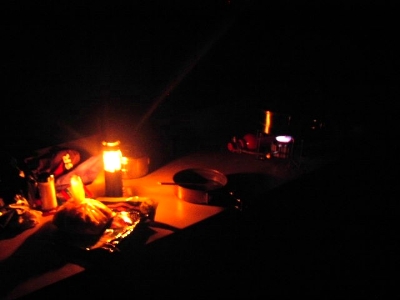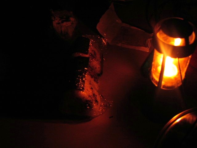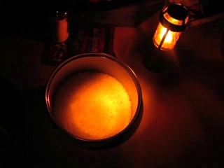 ゆっくりとホストさんと話し込んでしまったおかげで真っ暗。凡人の照明道具はこれですキャンドルランタン♪なんとも風情ありますよ。なんたって単なる蝋燭なんですから。キャンドルランタンの照明能力なんてたかが知れているのですが、暗さに目が慣れてきて見えないものまで見えるような感じになるのです。