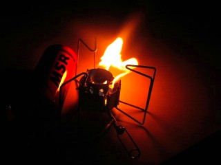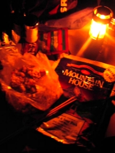 ほんでもってこの日の夕食を真っ暗の中料理しました。料理といってもこの火真っ暗になってしまいましたから、最も簡単なフリーズドライフードです。ドライフードは簡単でかなりカロリーが高いですから明日の登山に向けてこのくらいがよかろうっちゅう感じだったんです。ガスコンロをプレヒートして着火♪お湯を沸かし、ビニールに入ったドライフードに直接かけて待つこと15分完了です。これまで、なんかいこのドライフードで失敗してきたことか...凡人の使っているドライフードはアメリカ製品ですから、不味いのです。だいたい8割くらいは不味くて食べれません。が、これまでの積み重ねた経験でベストなのはマウンテンハウス社のSweet & Sour Pork with Rice これですよ。はい!lこれは数ある中で殆ど制覇してきた凡人が一押しします。甘い天津飯のような感じといっていいでしょうか。アメリカでBackpackingする輩、これはいけまっせ。ちなみに凡人は同社のOriental-Style Spicy Chicken にも注目していますが、まだ試していません。今度試してみたいと思っています。