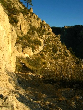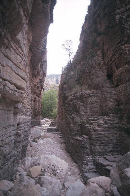 両脇を山に挟まれている、という表現が適切じゃないかと思います。アメリカで言うキャニオンの印象の多くは断崖絶壁に囲まれる世界ですが、そういう感じの場所ではありません。