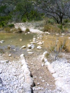 川の中を歩くことになる部分があるからです。でも、乾燥したこの場所では水はチョロチョロくらいか、干上がっていますので歩くに問題はありません。川自体、茶色に見えますが、それは例えばコロラド川でみる茶色とは違います。コロラド川などの茶色は今まさに土砂を削ってできたにごった水の茶色ですが、ここは川底が茶色していて水は愕く程に綺麗でした。こういった水場のそばを歩く分にはサラサラと音がしてとても気持ちいいのですが