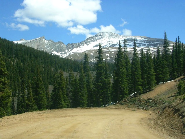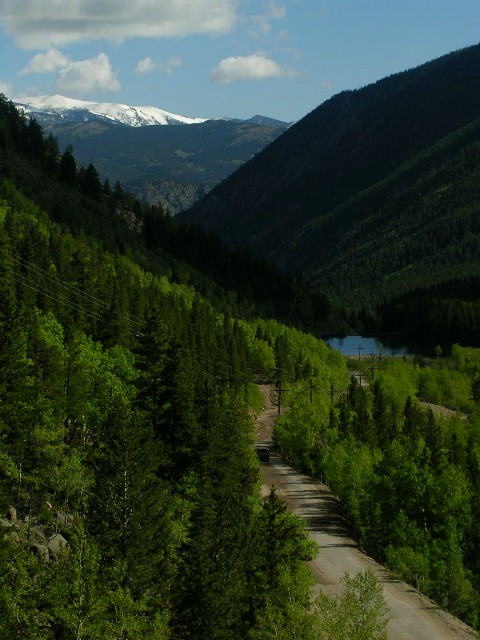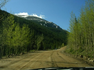 何度も何度もスイッチバックの繰り返しですが、それでも急勾配で山肌を登っていきます。5月、先週はフロリダの泉で夏を満喫したっちゅうのに、ここでは周囲の山は雪をかぶってそうです。 |