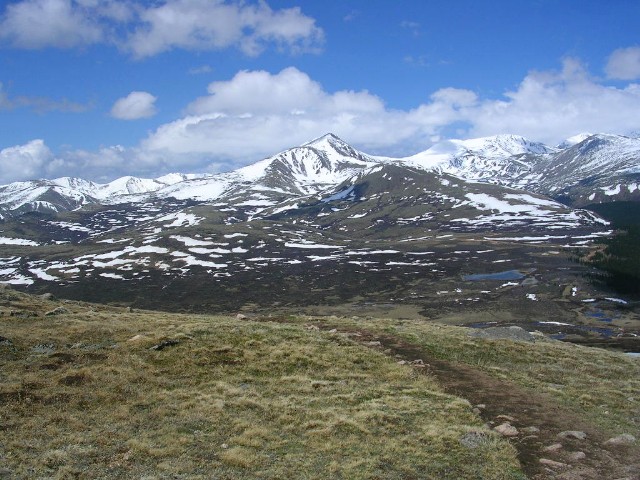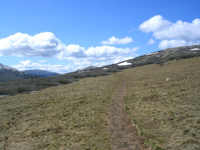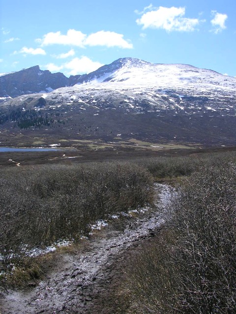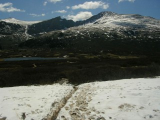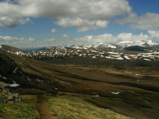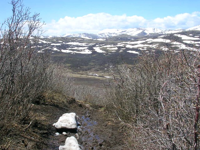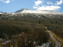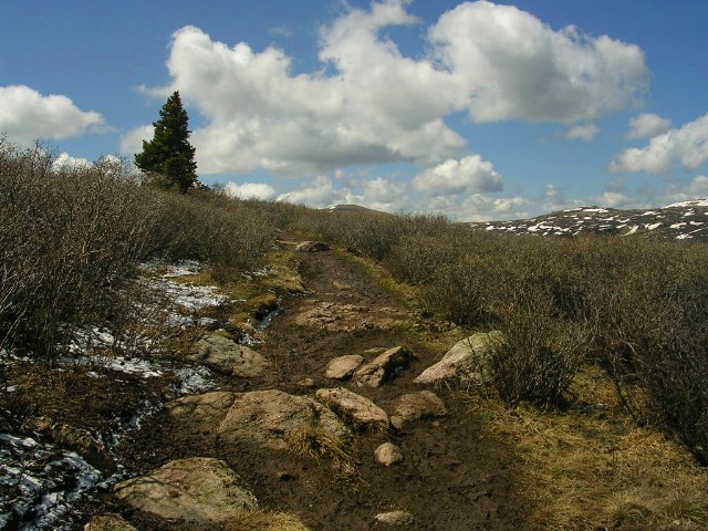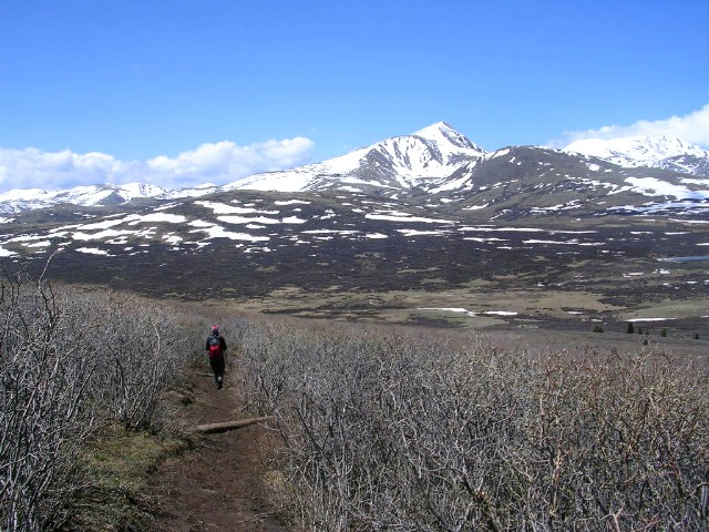 やがて、低い潅木、ツンドラの広がる平坦な高原を通り抜け、トレイルは山、岩場へと至ります。こっからが本当の |