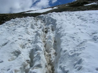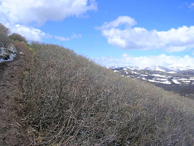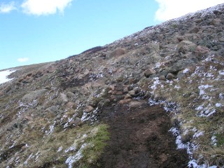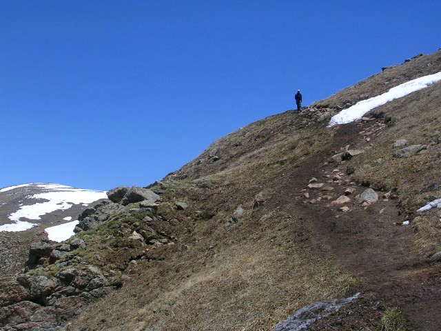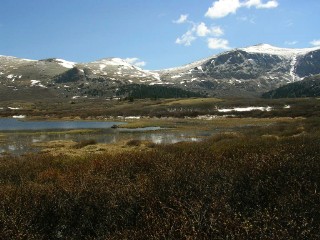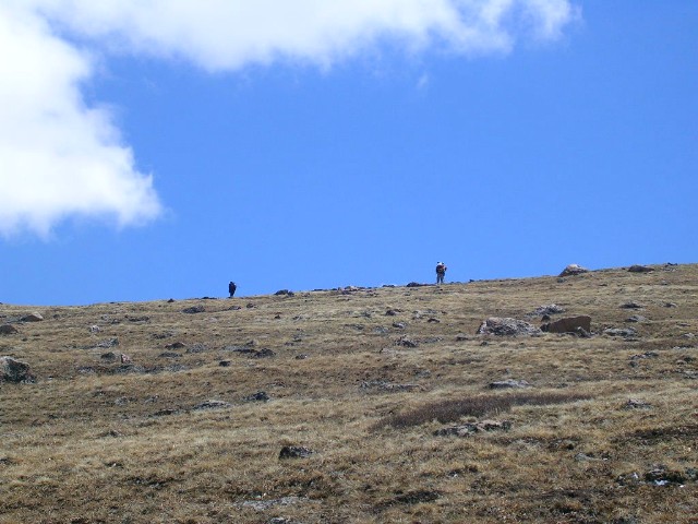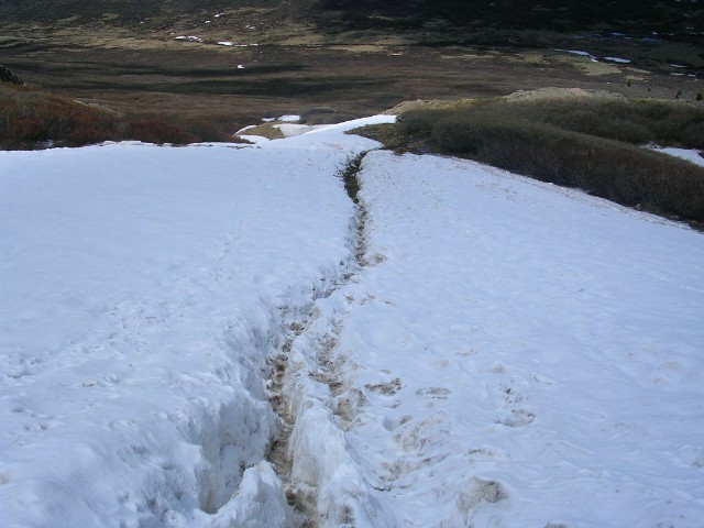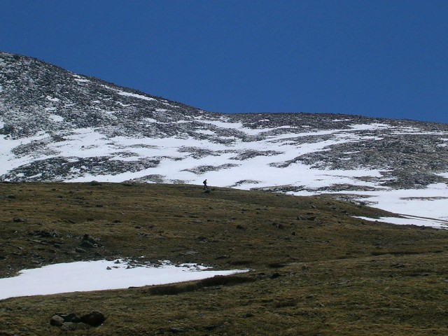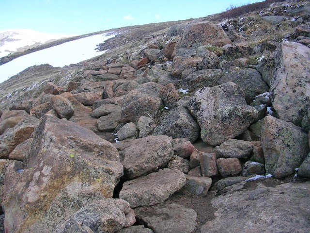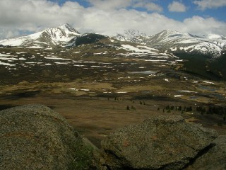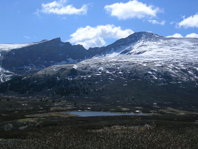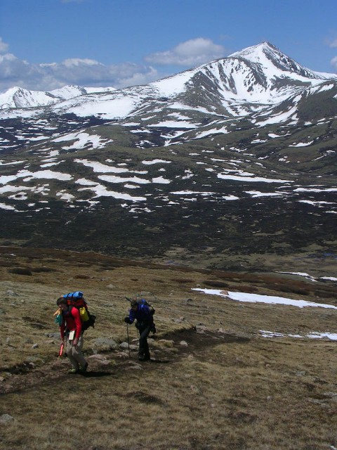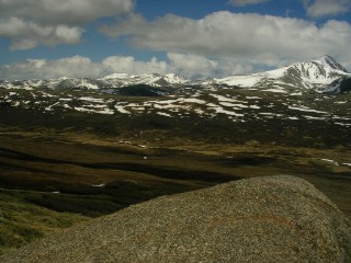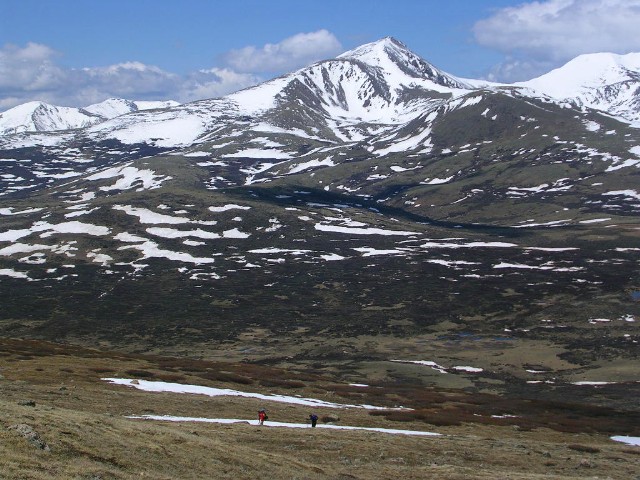 ですから、目の前に広がる高原はツンドラ主体で、所々にとても丈の低いタイガの森があるだけです。むつかしい言葉で言うと、よく伝わりませんね。えー、要するに何もなくって広々してて、爽快なんです。森林浴も悪いとは言いませんが、何時間歩いても森林ばっかりだと気分的にまいってきます。その点、この岩場と言うのは登るものの心を掻き立ててくれます。特に頂上付近の雪は、凡人のような無謀者をひきつける怪しい魅力に満ちてるのです。一応、凡人、