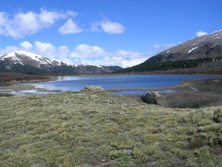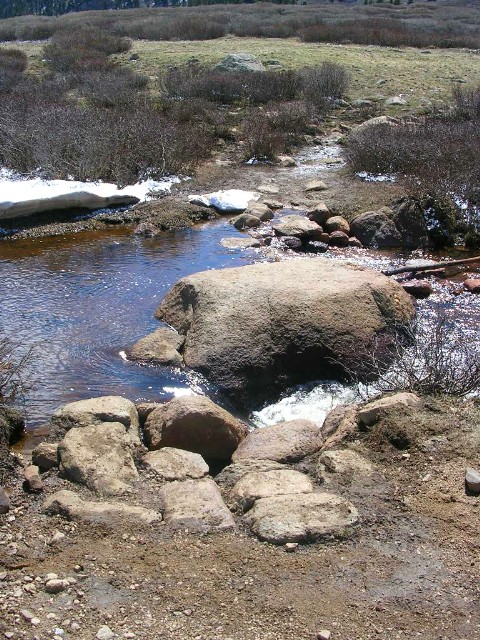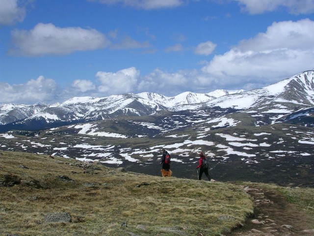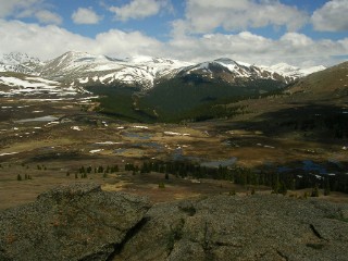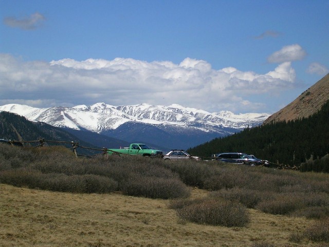 昨日、ジョージタウンの近くでキャンプしましたが夜は雪が降っていました。その雪が、まだ綿帽子のようにかぶってます。5月というのに新雪、高度が高度なので雪が降るのです。 |