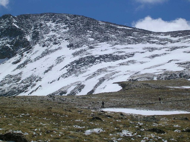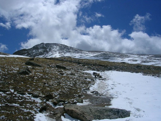 Peakがそびえてます。峠にある駐車場からは他より群を抜いて高い実に勇壮な山の姿が異様に美しい感じでした。よっしゃ、一発登ったろう。この山、高度4200m以上ありますが、車でかなり悪路を登ってきたので既にこの駐車場=Trail(登山道)の出発点は森林限界点の上です。 |