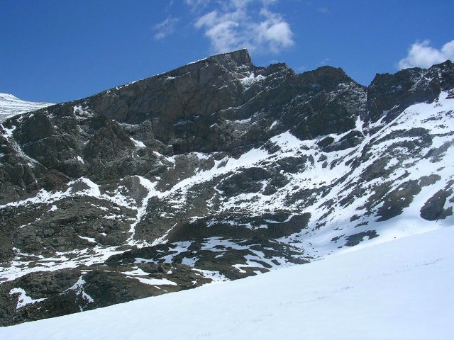 足元にロッキーの岩、眼下に広がる残雪と山肌のコントラストのまぶしい世界 |
