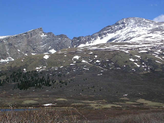 Peakなんでしょう。整然と広がる針葉樹林とむき出しの岩山、典型的ロッキー山脈の姿です。 |