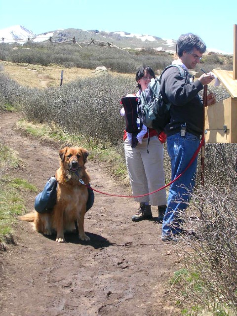 見てください。これは駐車場付近で撮った写真ですが、犬くんです。彼のイデタチ、完全なBackpackerですね。Backpackしょってますよ。単にハイキングする犬はNational