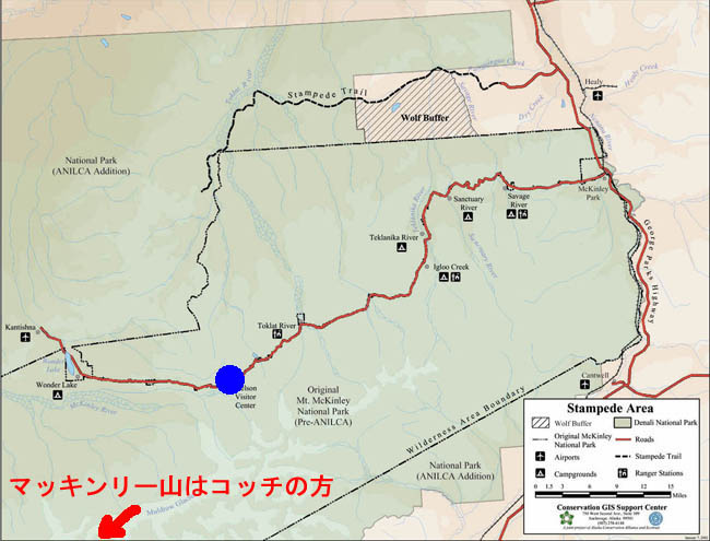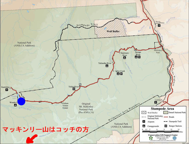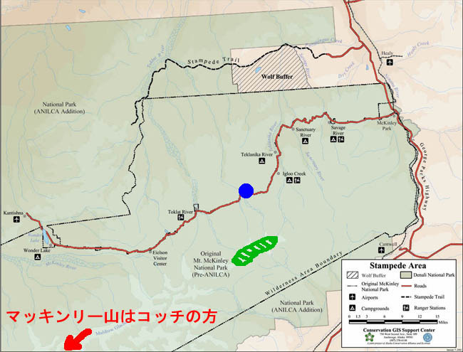 デナリ国立公園です。2004年8月、凡人は憧れていたこの場所に遂に来ました。デナリはアサバスカ・インディアンの言葉で『高い奴』、『偉大なるもの』とかそんなニュアンスの言葉です。マッキンリーのことを指します。例年8月のデナリは雨が多く、滅多にマッキンリーを望むことは出来ません。凡人は植村直巳さんを飲み込んだマッキンリーをこの目で少なくとも見たい、そう思いました。デナリ国立公園の中で最もマッキンリーに近く美しく見える場所、ワンダーレイク(左の青丸)をBaseキャンプ地として選びました。 |