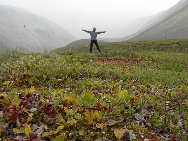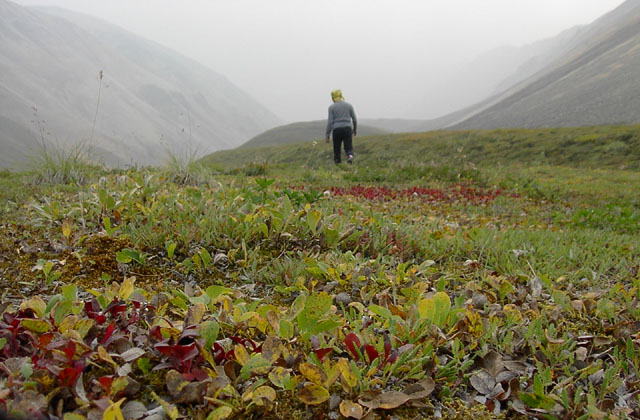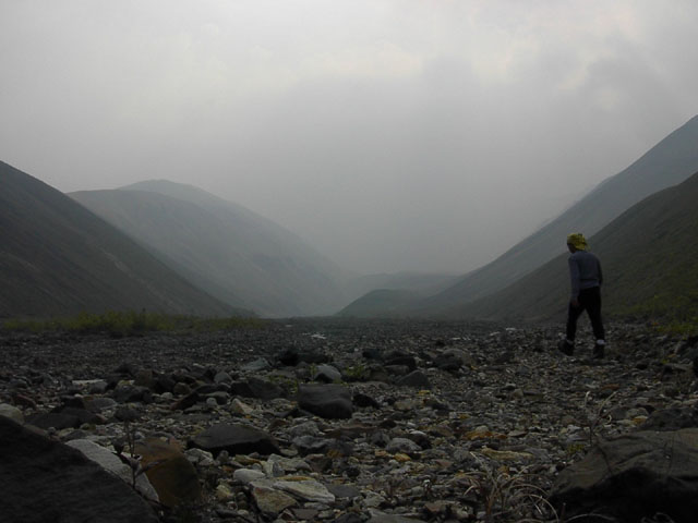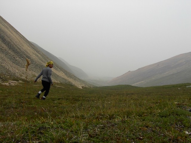 しかも地図でみる氷河なんて実際には何処にも見えません。視界に広がったのは広大なツンドラだけ。凡人、大地にひとりポツーンと一人たたずんでます。先は煙ってて見通しが利かないのです。