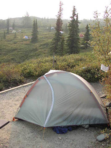 ワンダーレイク・キャンプ場の周辺は典型的にはツンドラが広々と広がってます。写真は早朝、日の出前です。寒かった。夏8月なのに気温朝方0度くらいでした。朝露が当たり一面にビッシャリおりています。この日、好天にもかかわらずやはり火災の煙で曇って見えます。本来、この中心にドカーンとそびえるマッキンリー山があって、凡人のテントから寝転んでそれを眺められる予定でした。しかし、このとおり... |