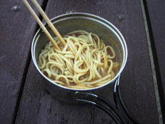 ですから、この日、朝早くから凡人は起きて行動開始。まず朝食を作りました。乾麺のうどんを煮て、余っていた昨晩のカレーと混ぜくり、カレーうどんにしてたべました。6時頃のことです。 |