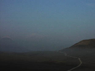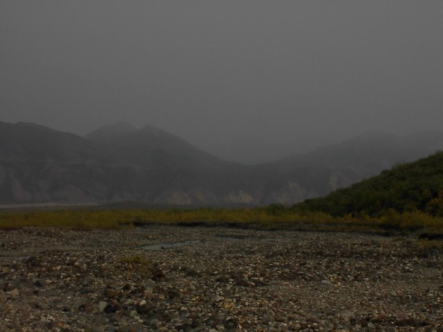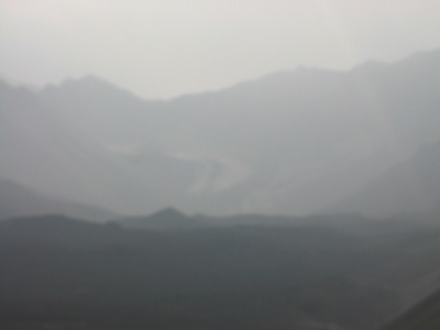 右手のツンドラ最高到達点から山の先の方の眺めです。この煙濃くなった先には氷河があるに違いなかったのですが、この場所まで来てすら、やはり見ることは出来ませんでした。