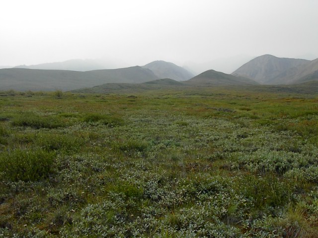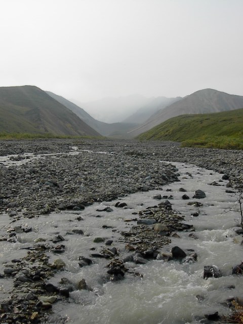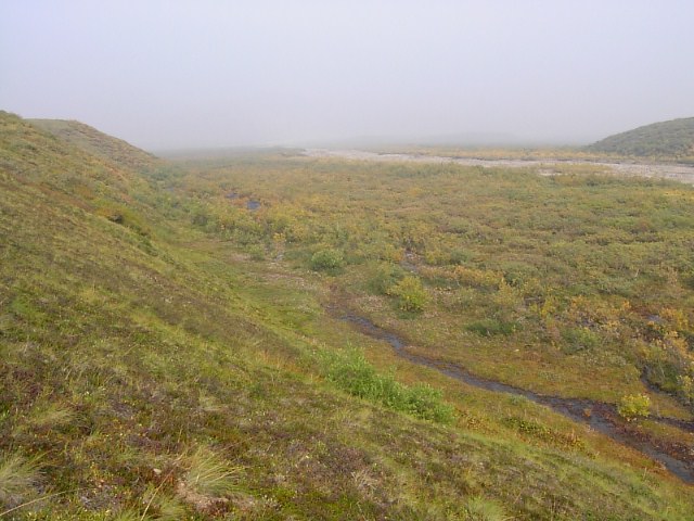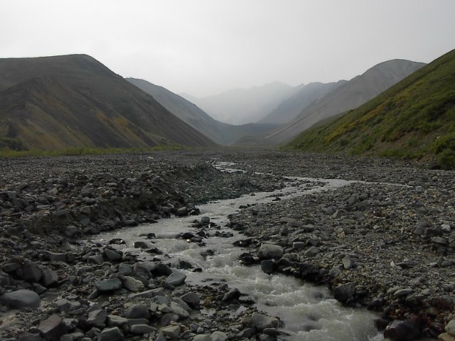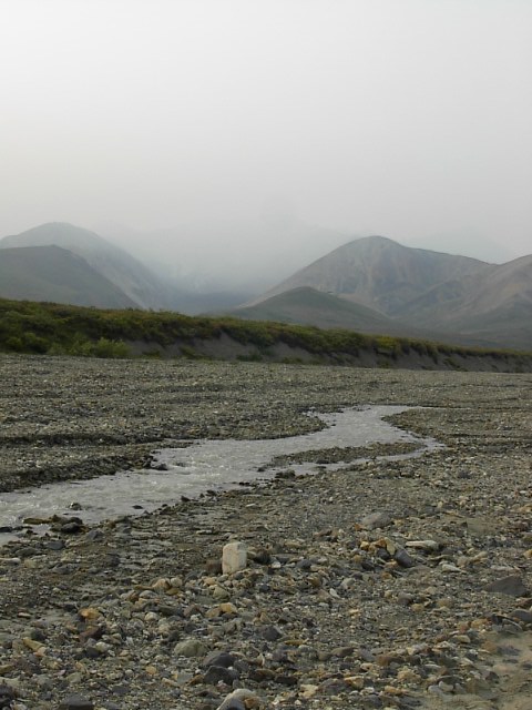 Polycromeを高い所から望むとこんな感じです。写真左にほうがPolycrome。この高台の下にツンドラの大地が広がり、そこを氷河から来る川が流れているのです。この場所も、ワンダーレイク、アイルソンと同じようにやはり曇っていました。。。本当に、今年の乾燥した季節、そのために生じた大規模な火災には恨めしいようなそういう気すらしました。 |