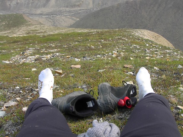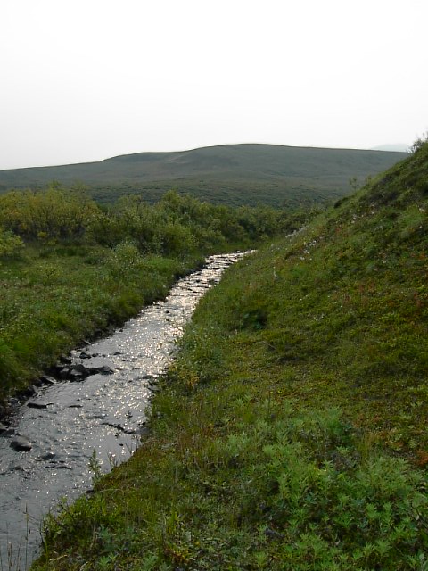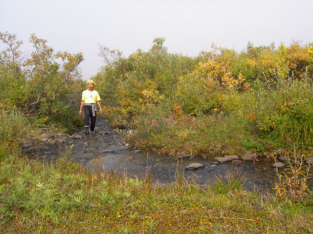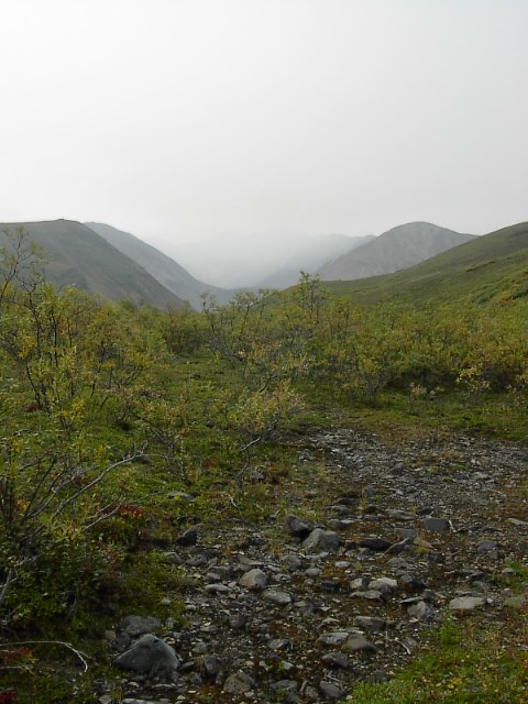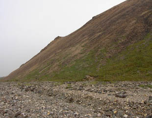 Busの時間がLimitation)。これに乗り遅れれば、それはテント、寝袋はおろか食糧もなしに寒いアラスカの一夜を越さなければなりません。それはとても危険なことです。この自分の右手のツンドラの覆う場所の頂上付近をもってPolycrome探検の最終地点としよう、と決めました。できれば、氷河が見れれば100点だなぁ。と、かすかに思いながら。 |