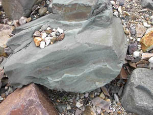 この辺の石、石の中に石が埋まっていたり、地層そのものが石の中に閉じ込められたりしています。これまで見てきたのとは違うそのことに、この先にあるであろう氷河を期待しました。 |