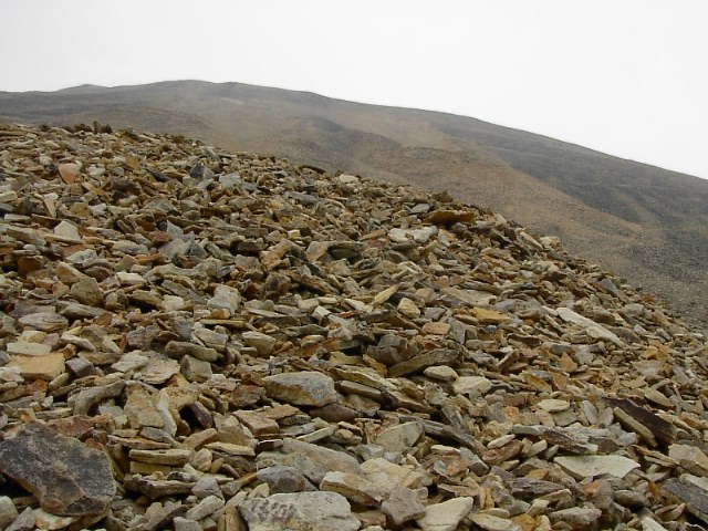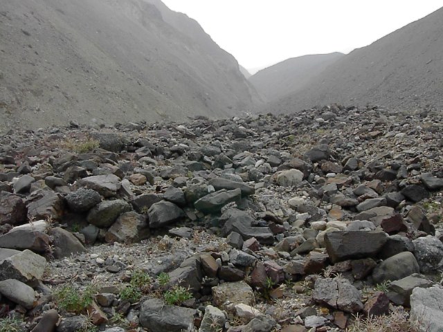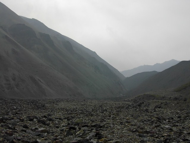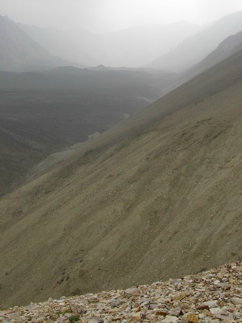 右も左も剥き出しの大地のなす急勾配。草木はそこを覆ってはいません。比較的小さい10cmほどの石が、無造作にガラガラと積み重なっています。遠くない過去にここを氷河が侵食していた、その結果であろうと、そう思いました。 |