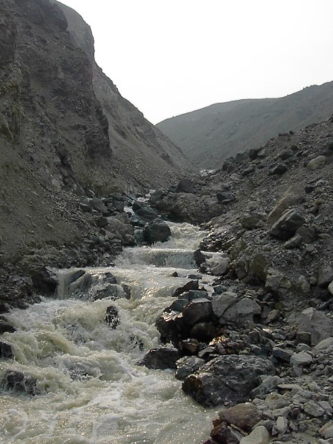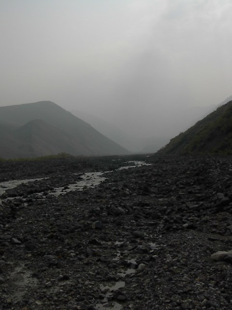 嬉しくて嬉しくて仕方なかったです。潅木をかき分けて、視界が急に開け、この川原に最初に抜け出た瞬間。この汚い川は100%その上流に氷河があることを確信させたからです。これを見かけるまで五里夢中、氷河が本当にある証拠など何処にもありませんでしたから、この川を見つけた瞬間、歓喜の想いが胸に広がりました。それにしても、広い川原です。 |