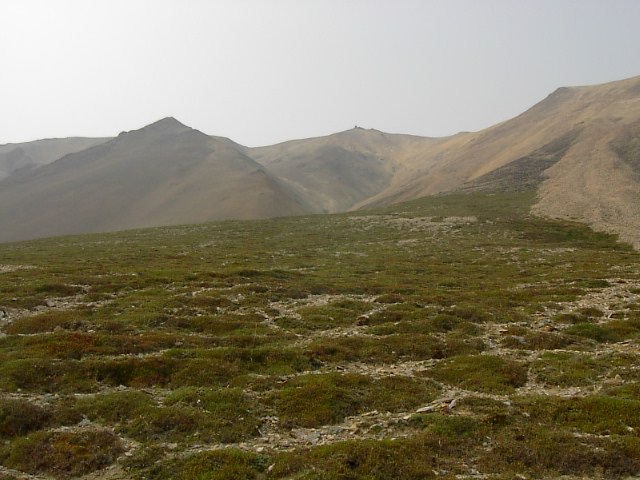殆どの山は恐らく氷河による侵食のためだと思いますが、急斜面を砂利、ゴロゴロの小さい石、砂の堆積がその表面をなしており、登山体制(アイゼン、ピッケル、ザイル)のない自分には危ない感じでした。が、いくつかの山はその表面をツンドラが優しく覆っており歩くのに都合がいい状態でした。その一つに登りました。