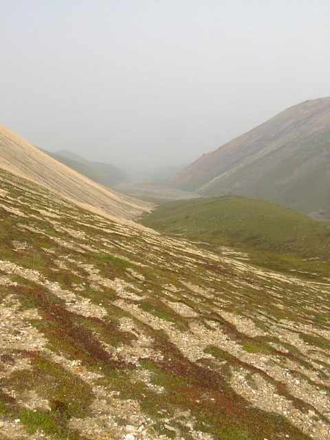 そして、そのツンドラを登りました。かなりの急斜面で苔が足元にあってすら、登ってきた斜面下を見るのは怖い感じでした。地衣類のない剥き出しの場所に足を踏み込むと、足場は簡単に崩れます。やっぱし、どう考えても危ない場所です。足場を守ってくれるツンドラというのはその点優しい... |