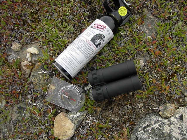 熊の世界、効かない視界、これら2つだけが自分を守り正しい方向へと導いてくれる(ハズの)道具でした。(Bearスプレーって唐辛子粉入りらしい。未だにものは持ってますが熊と遭遇して使ったりしたことはないんでホントのことは分かりませんが。) |