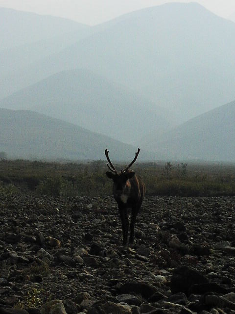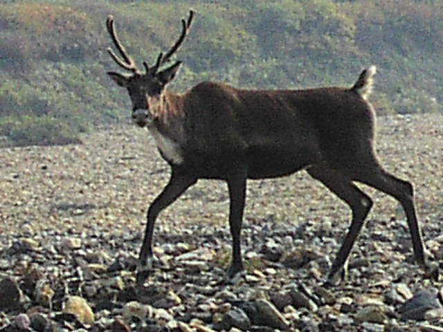 帰りしな、その川原でカリブー(トナカイ)が目の前50m程のところに現れました。凡人のほうが萎縮してしまい、川原に小さく身をかがめて座って通り過ぎるのを待ちました。 |