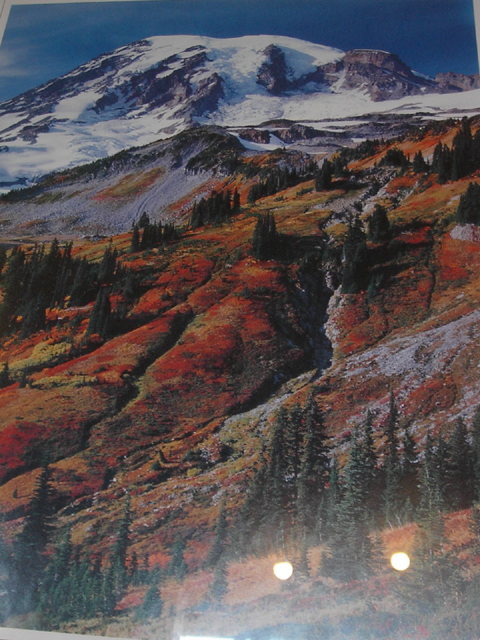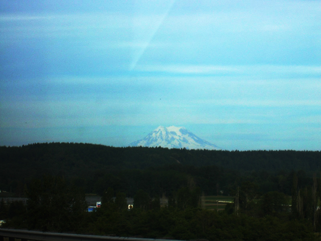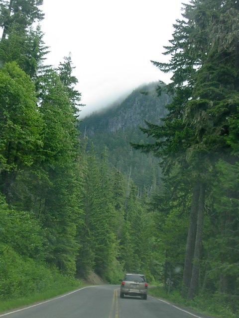 シアトルから南に車で1時間半。マウントレーニエという山を見ようというTripです。途中、とても丈の高い針葉樹林が道路両脇にそびえたっています。中西部〜ロッキーでこれまで見てきたどの森よりも丈の高い森に少々驚きました。全部30mくらいあるのではないだろうか? マウントレーニエはカスケード山脈系の一番南の方にあってこの辺りでは単独で高い山です。日本人はタコマ富士などという名前でよんでいるそうです。