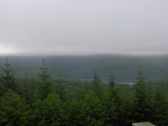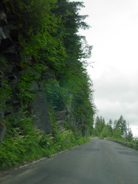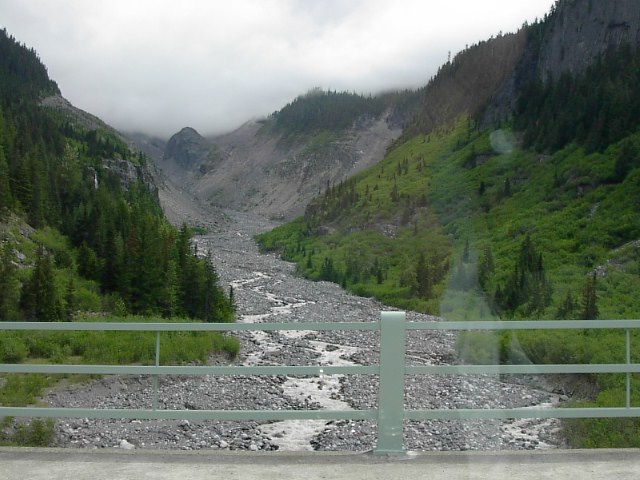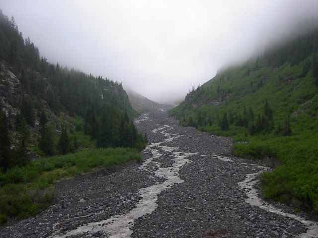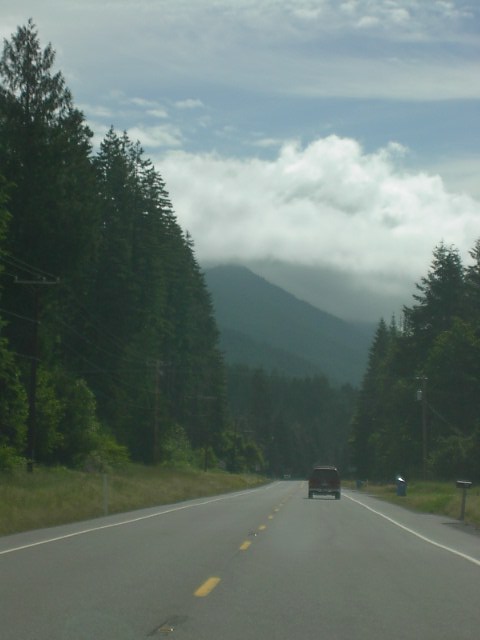 山に向かう途中、崖っぷちに道路が作られていたりします。いつも思いますがアメリカ人は凄い場所に道路を上手に作るもんだと感心します。目的の山に接近するにつれて絶望感に浸りました。山の上のほうは深い雲に覆われていて全く見通しがきかなさそうなのです。それでも一応、先に進みます。 やっぱし、厳しそうだな。。。山の上のほうなんか見えやしない。 こりゃ、駄目やろ。そう分かっていてもこの場所ってマウント・レーニエ以外に目だったものは何もない場所。先に進みました。 途中、川がありました。川の上流もこの通り、何にも見えません。。。