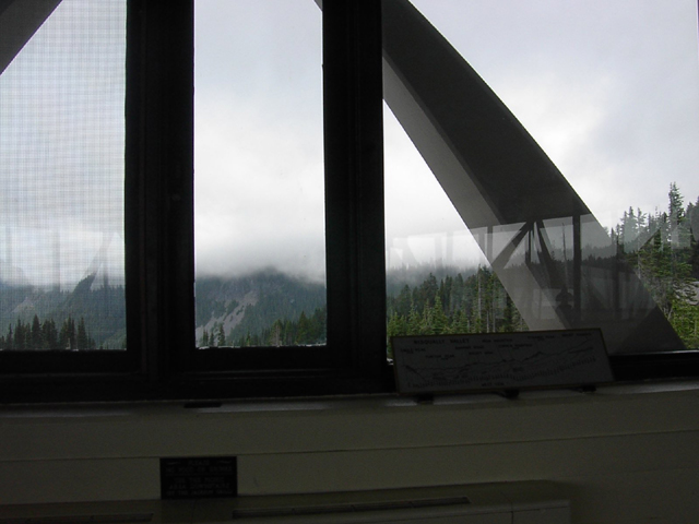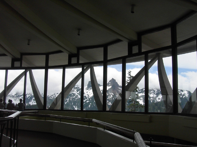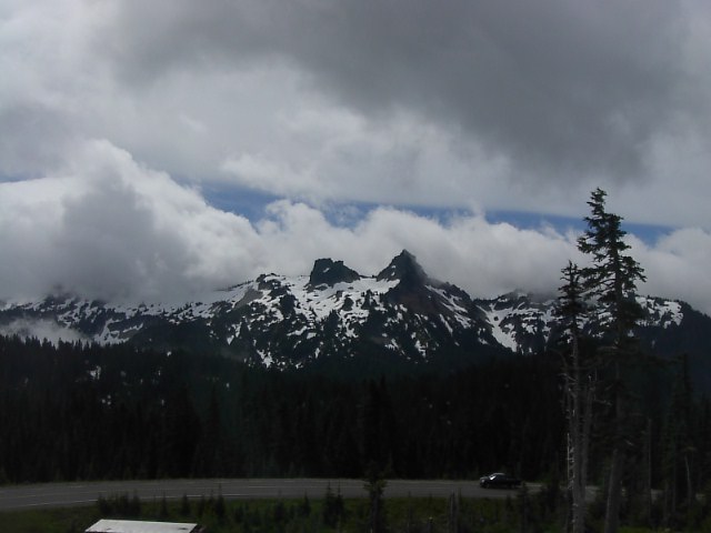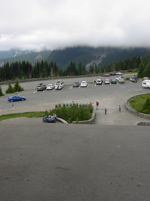 7/3に見れなかったので7/6に再度行ったんです。その時の撮った奴なのですが、残念なことに憎いくらい同じような天気で全く頂上なんか見えやしなかった。。。残念。何しに2回もきたんだか...目の前に雲がかかっているんです。しかもこれだけ濃い雲。ま、雲と同じ高さまで来たことには感慨深いものはあったけどでも、山を見にきて山が見えないと流石にどうしようもありません。 7/6に行った際には途中に少々の脇役の山が見えはしたのですが... 7/3に行った際にはこのvisitor center全貌すら見えないくらい雲がこの辺りを覆っていたのに7/6にはそれが見えたのは少しだけよかった点か... (肝心要ではないんだけどね。) そのvisitor centerの上の階から駐車場を見下ろすとこんな感じでした。駐車場のすぐ上が雲です。 確かに先の脇役の山は見えるのですが... 肝心のマウントレーニエの側はこんな感じで、こりゃどうにもなりません。残念ながら。 もし、マウントレーニエが晴れていたら7月、季節は初夏。高山植物に囲まれたこの写真の景色が目に飛び込んでくる予定だったのですが。ま、これだけ雲、雲、雲だと諦めもつきます。 高さ4000m超えるこの山はいくつもの氷河があります。それも今回はおあずけ。本当に残念ですがマウントレーニエ制覇は今後の問題です。 実際には7/5にタコマ付近でI-5を運転していた時に見えたこの景色が自分の見たマウントレーニエの最も美しい姿でした。タコマ富士とはよく言ったものです。確かに日本の富士山そのままの美しい稜線です。いつか、この山を間近に感じたいもんです。