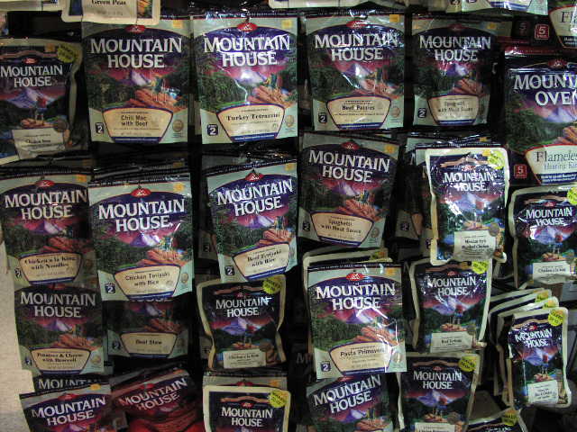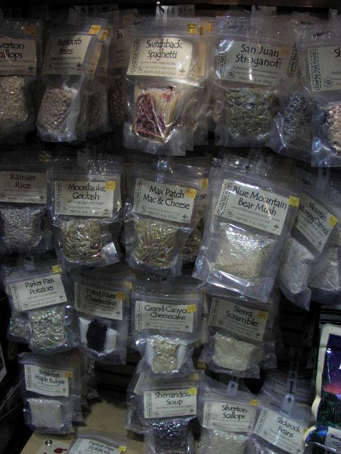 道は一本だけあると書いたが、公園の中にはツアーバスとシャトルの進入しか許されておらず一般の人の自家用車は公園入り口までは許されているもののその先には入れない。オートキャンプはマッキンリーの見える場所では出来ないわけだ。 写真は数々のドライフード@ 『へー、こんなんがあるのか。Kenedy宇宙センターで見た宇宙食と似てるなぁ。パスタ、乾燥させた野菜、肉なんでもあるやん。Backpack〜って感じだなぁ♪』 |