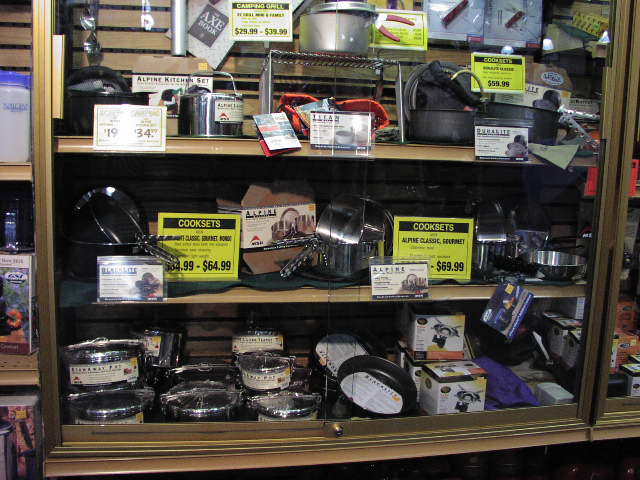 つまり『マッキンリーの完璧な姿を間近で見よう!!』 これがすべての事の発端だ。キャンプ場を予約した直後、詳細を知って少々しり込みしそうになった時にこう思ったのを思い出す。 『ま、飯もどうにかなるやろ。ワッハッハ。』 写真はコンロ群 『ついに発見!!コンロだ。アメリカでも日本でも使える奴、1週間の燃料がコンパクトにすむ奴、火力が十分強い奴。そういうのが欲しいなぁ。』 |