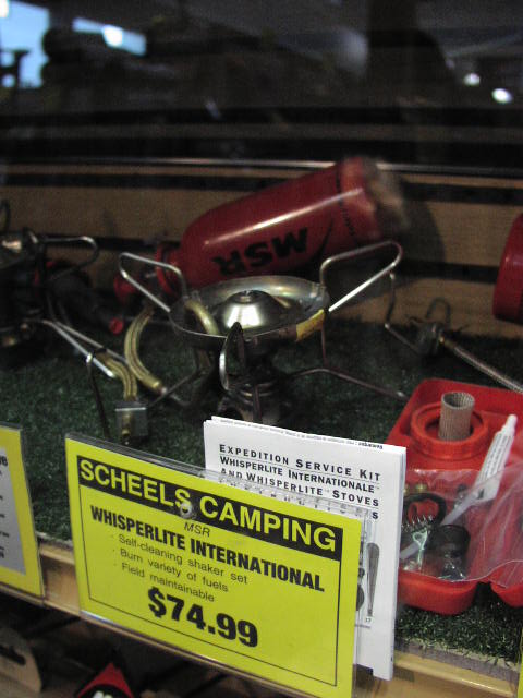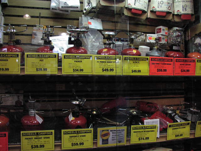 というわけでScheelsのキャンプコーナーに向かって最初に揃えようと考えたのが、一番心配した食事のこと、特にコンロのコーナーである。火はなければ料理は難しい。人間は火を自由に使う唯一の動物なのだ。 ちなみにキャンプサイトでの焚き火は禁止されている。 写真はガソリンコンロの一例 『コンロだけは最高級の信頼されたものを手に入れよう。飯がなきゃ、キャンプにならんからな。どれにしようかなぁ...うーん。』 |