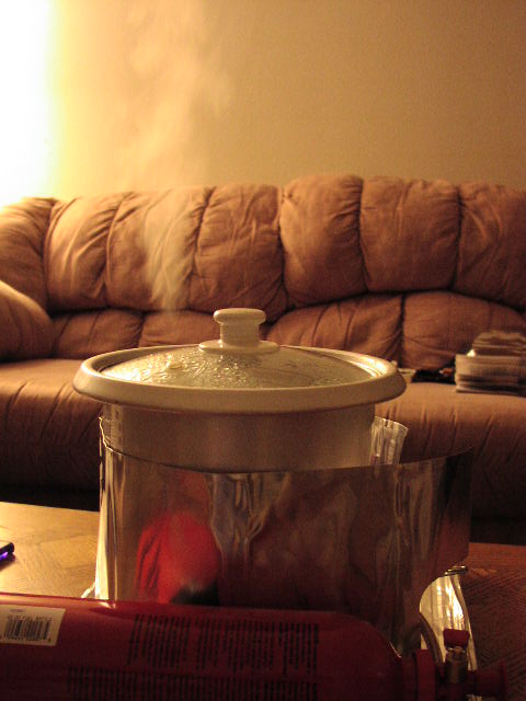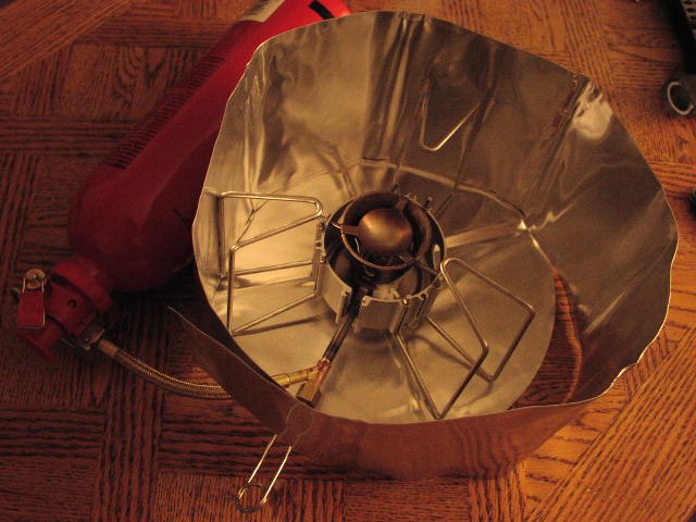 反面、ガスコンロはプロパンガスボンベ1タンクで1時間弱しかもたない。 今日は部屋の中での演習なので周りに風よけはいらないけど一応使ってみました。これは熱反射の性格も持っているのでガソリンタンクの安全さを確保する、熱する物に効果的に熱伝導させる、という利点があります。 |