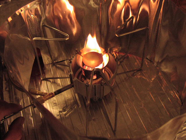 ガソリンコンロの難しさはその使い勝手が少々難しいこと。いいかえればより玄人志向が強いことである。 そしてガソリンを出し、火を本格的に強くしました。 『ジーン』 感動しました。Backpack生活にグーンと近づいたことを感じた瞬間です。そして驚きました。その強力な火力に。ゴォォォォーーーと音がしてます。これなら風になんかまけないだろうと確信しました。不完全燃料もないみたい。 |