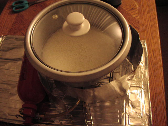 100ドルだして購入した機器は中学校で学んだガスバーナーのシステムにとても似ている。なつかしいものだ。かつてコックをあける順番、閉める順番は最重要項目としてテストの山になっていたものだ。 先に蒸らしておいたご飯はこのとおりです。何の問題もなくご飯が炊けることを証明できました。 |