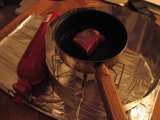 Preheatの方法は千差万別だが、一般的にはコンロのガソリンを少し出してそれを燃やす方法と何か別の物を燃やして使う方法とが知られているみたいだ。 そして、米は一旦おろします。10分間火からおろすのです。 その10分間を使って肉を焼きます。ステーキです。一番簡単な料理だからです。 |
