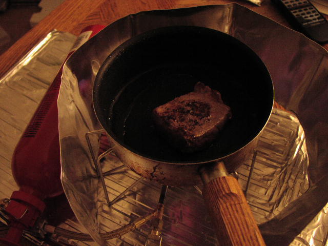 このプレヒートが上手く出来ないと不完全燃焼の原因となる。またガソリン爆発の危険もはらんでいる。これが一番確実、簡単に出来る機器を買おうと決心した。 数分でこんがり焼け、いい匂いがし始めました。そしてひっくり返します。(この後、10分くらいでステーキ完了。次におろしておいた米を中火で3分たきます。そして米を再度おろし10分蒸らします。) |