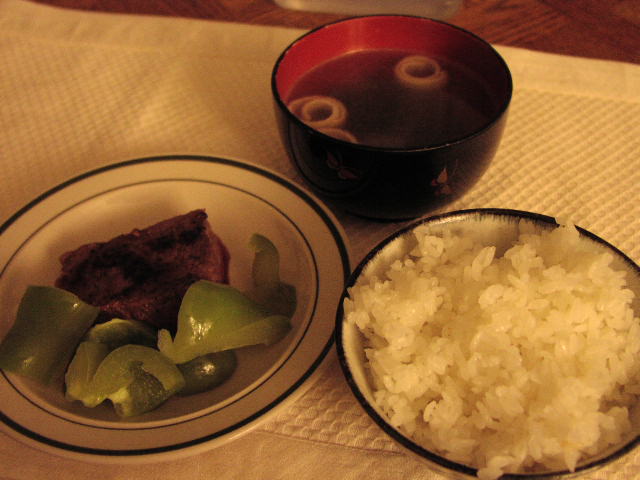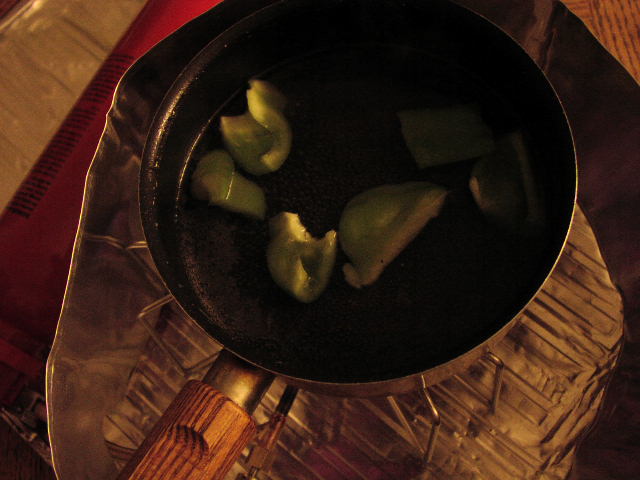 それが上の写真の奴だ。これは独自のPreheatのシステムを持っていて間違いが少ないように出来ている。 米を10分蒸らす間に今度はお湯を沸かします。汁物を作るのです。同時に、野菜ものとして今日はピーマンを蒸すことにしました。 |