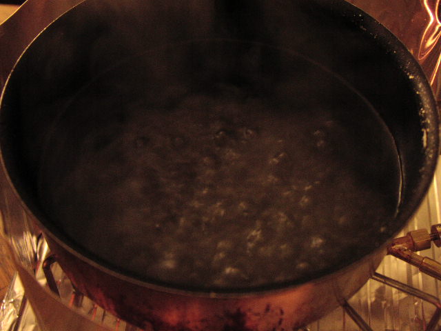 ガソリンコンロの一番難しい点は最初に機器をあたためる(ガソリンを上手く気化させる)ためにPreheatを行うという点である。これには多少の経験が必要みたいだ。 そして数分で沸騰しました。強火のまま沸騰させ続けて待つこと3分。 |