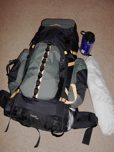 これが浩二君の6月12日時点で揃えたBackpack一式です。新たに、バックパック(Keltyのコヨーテ)、雨合羽、紐、雨にも耐えるテント、水筒を購入しました。かなり揃えましたがまだ、全てそろったわけではありません。喜んでバックパックに詰め込んでみました。皆、全てバックパックに納まりました。でも、思いのほか一杯いっぱいです。食糧を入れない状況で12キロです。結構重いですが、背中にしょうとそうでもありません。購入前に自分の背中の形にピッタリ合うものを選びに選んだので思ったとおりピシャリあってます。バックパックが胸〜肩〜背中全体〜腰と満遍なく重さが分配されるようになっていてきつくないのです。しかし、それにしても一杯一杯になってしまいました。