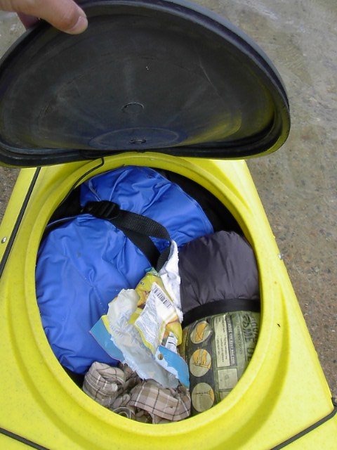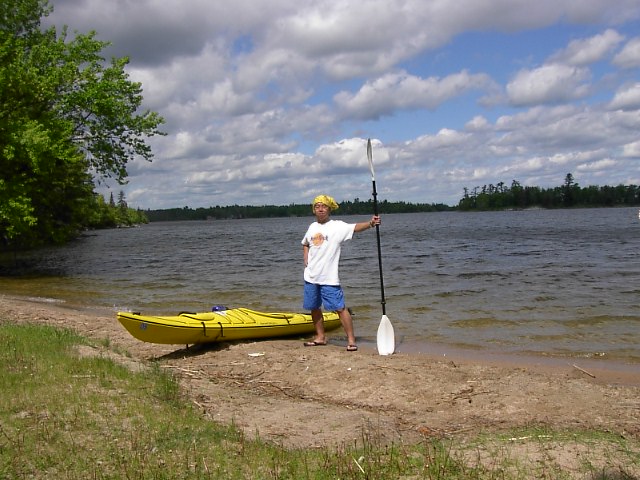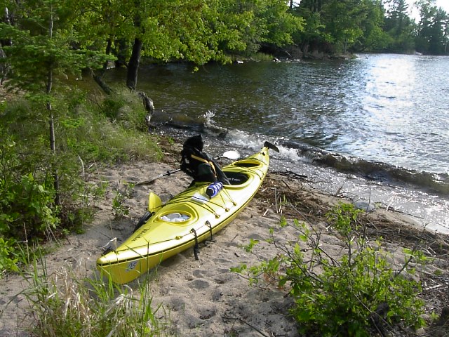 ガーン。Iowaからはるばる10時間運転して来たのに、キャンプサイトを目の前にして退散するのか...それはありえません。そこでプロの人に相談しました。カヌーでは危ないので風に強いカヤックがよかろうということでした。カヤックは初めてです。10ドル払って講習を1時間程受けてカヤックによるバックカントリーに出ることにしました。一旦湖に出れば水も食糧も自分で全て何とかするしかありません。全て自分でなんとか...という点は今回の目的にピッタリです。今回はカベトガマ湖という場所から出発して沖合い3キロほどの小さな島のキャンプサイトを狙うことにしました。カヤックは丸一日借りて、講習代も含めて55ドルでした。いろんな場所と比べれば安いもんです。カヤックにバックパックの中の荷物を載せなければなりません。当然、バックパックは大きすぎて直接は入らないので中身を一旦出してカヤックに積み込むことになりました。これだけの量をつめるのだろうか?そしてカヤックは水の上を本当に進めるのだろうか? と、そういう心配をしましたがそんな心配は杞憂であることが分かりました。カヤックのお店の人が言います。