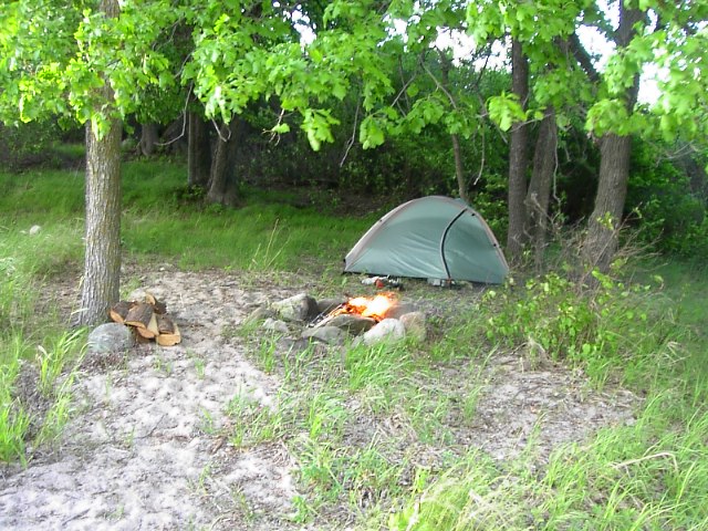 仮にひっくり返ってもカヤック自体は沈まないし荷物は濡れない仕組みになっています。これも更に自分を安心させてくれます。ただし、水は凍えるほど冷たく10秒も入れておくとジンジンしてくるほどです。湖の上の浅い場所にはカモメが水中の岩に立っていて湖面の水で足を冷やしています。この写真のカモメはつまり湖に浮いているのではなくて水中の岩の上に立っているのです。なんともお気楽なもんです。余りちかずくとバタバタと飛んで逃げてしまいます。 そして目的の場所に到着しました。島の海岸は殆どが岩場でカヤックでの接岸はかなり難しいのですがこの島の一部には砂浜があって簡単に接岸できました。3キロのカヤッキングにかかった時間はおよそ1時間でした。ここはまさに無人島。小さな島で周囲500mくらいだと思います。殆どが木に覆われています。 木陰で風が穏やか、かつ雨が降ってもかなりよさそうな場所を選んでテントを張りました。今回初登場のテントです。初めて使う奴だったので30分ほど時間がかかってしまいましたがようやく完成です。このテント重さは3キロですが全て2重構造になっていて外側は完全に耐水構造です。雨もOK。頼りになる奴です。大きさは2人は眠れるだけのスペースがあります。 そして近くのFire placeで焚き火をはじめました。沢山の焚き火用の薪が見つかったのです。あっという間に火がともります。いかにもキャンプです。