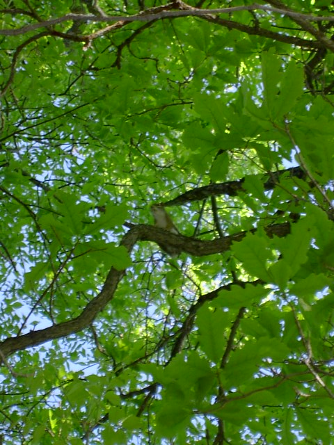 でも木の上に方にも鳥の姿はみられません。なんだろ?と思ってよーく声のするほうを見ているとリスが自分の方を見て啼いていました。驚きました。Iowaでも沢山見かけますがリスは啼きません。でも此処のリスは激しく啼いてます。