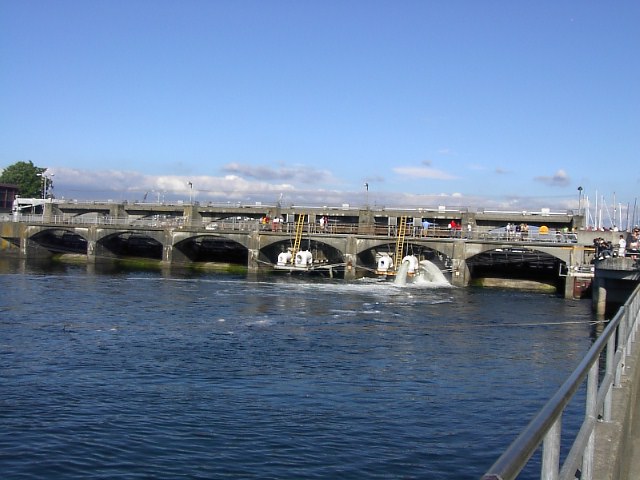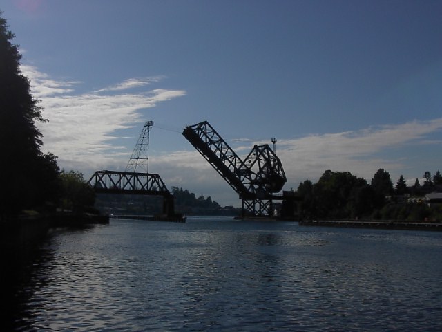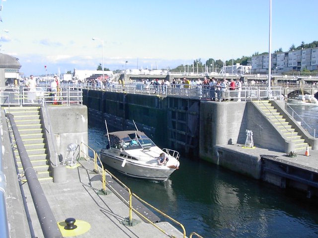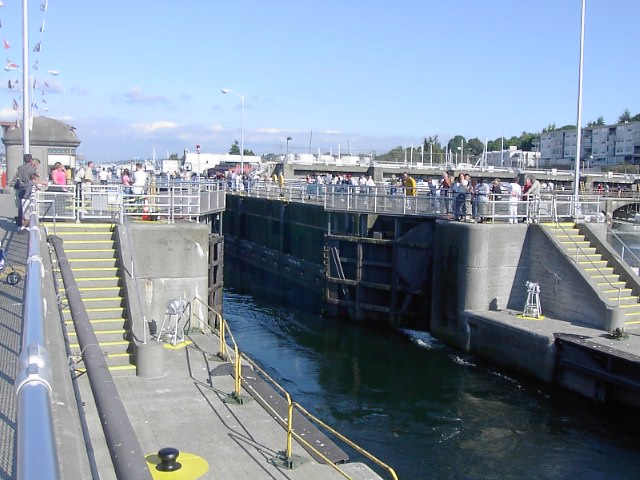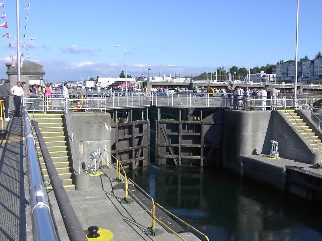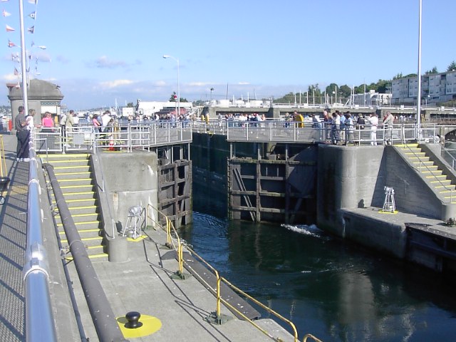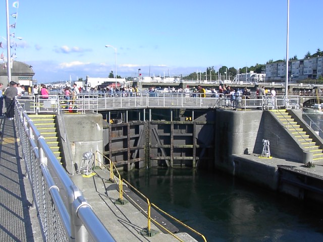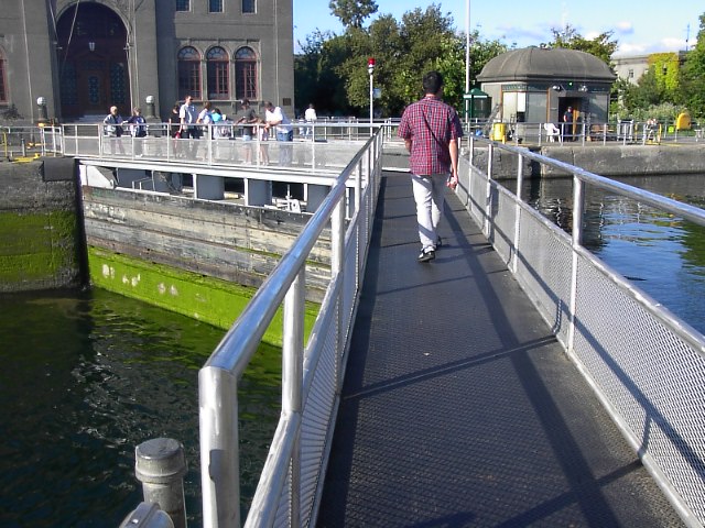 その橋のかかった湖は海と運河でつながっています。しかし、海面と湖面の高さの差は実に11フィートもあるそうなのです。海と湖は仕切られていてそこを区画ごとに水位調節して船が出入りする仕組みにしてあります。湖は安全な港になっている訳です。写真に写っている水門=歩行道路の左が海、右が湖です。かなり水位差があるのですが分かりますか?